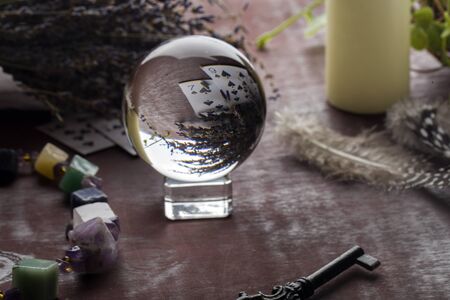 Divination with white candles, lavender, fortune-telling ball, stones, cards and key. occult and esoteric objects witch wooden table