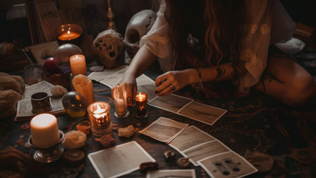 Sorceress telling fortunes using cards and candles