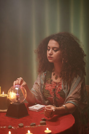 Serious fortune teller touching crystal ball in front of her