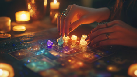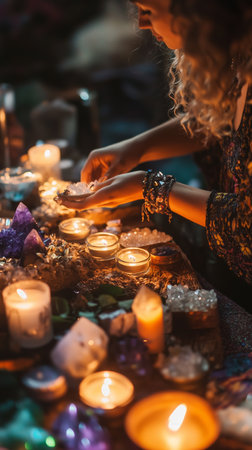 A mystical gathering with candles, crystals, and a womans hands creating an enchanting atmosphere in a dimly lit room at night
