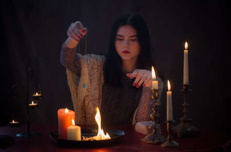 Woman fortune-teller guesses fate of night at table with candles
