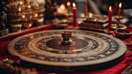 A beautifully crafted astrology wheel placed on a vibrant textile, surrounded by flickering candles. This captivating scene embodies mystical energy and spirituality, ideal for rituals, meditation, and inspiration in esoteric practices.