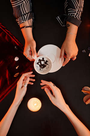 Top down view at female fortune teller reading coffee grounds telling destiny in seance with young woman