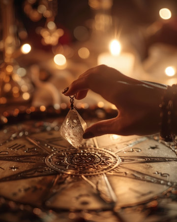 Mystical Crystal Pendulum Over Zodiac Wheel with Candlelit Ambiance for Spiritual Connection