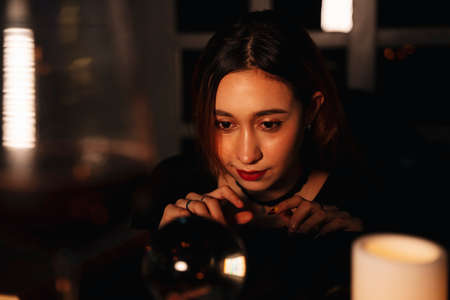 Beautiful young long hair woman fortune teller predict the future with crystal ball.