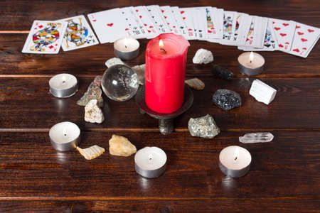 Bangkok, Thailand, March.15.20.On the table are fortune-telling cards, a magic ball, magic crystals and a lighted candle.Magic sessions with clairvoyance cards. Card reading by candlelight