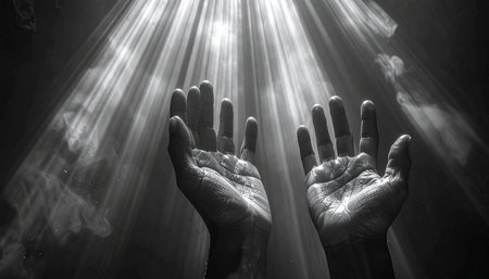 Black and white image of hands raised upwards, illuminated by dramatic light rays piercing through a smoky atmosphere, evoking a sense of spiritual...
