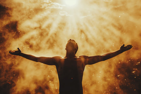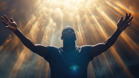 Black Man Worshiping with Hands Raised in Sunlight