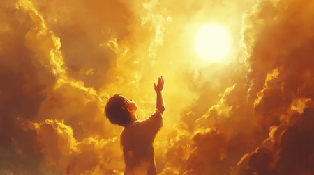A child stretches out their hand towards the sun breaking through clouds, surrounded by warm, golden light that radiates hope and positivity.