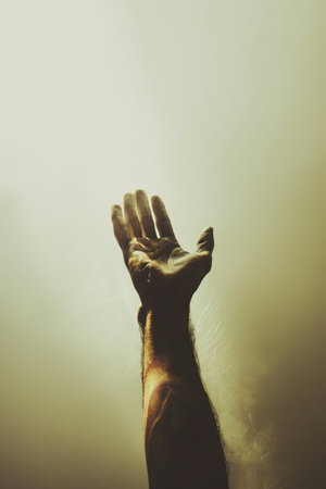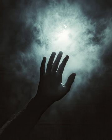 A hand extends upward, yearning to connect with a bright, otherworldly light that breaks through swirling fog, creating an enchanting ambiance.
