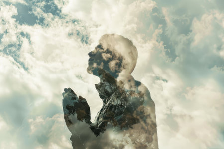 A man is praying in the sky with clouds above him. The clouds are white and fluffy, and the sky is blue. The man's hand is raised in the air, and he is in a peaceful and spiritual state