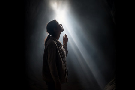 Woman praying in the dark room with light coming from behind her.