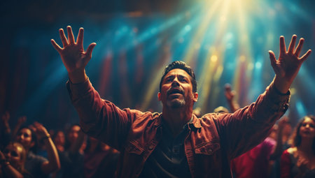 Man raising hands in worship in front of people in the church. AI generated