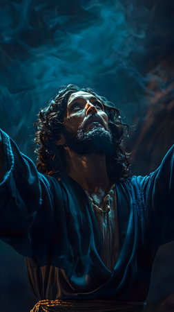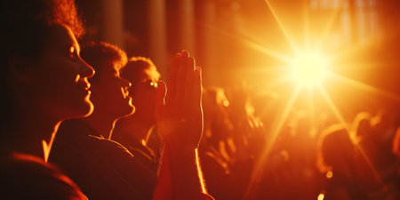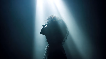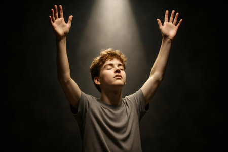 Teenager with arms raised and eyes closed, worshiping passionately under a brilliant spotlight in a dimly lit room, embracing faith and spirituality