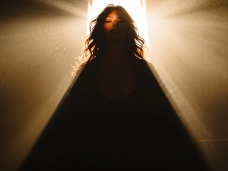 A striking female silhouette emerges beneath intense lighting, with beams piercing from above, creating a powerful and evocative atmosphere.