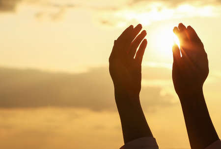 Human hands open palm up worship. Eucharist Therapy Bless God Helping Repent Catholic Easter Lent Mind Pray. Christian Religion concept background.Fighting and victory for god.people prayer at sunset