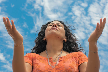 a Hispanic Woman Offering Gratitude in Prayer: A Hispanic woman standing outdoors with her hands raised in gratitude and prayer, her face uplifted towards the sky. The studio background is a vibrant blue, symbolizing faith and hope