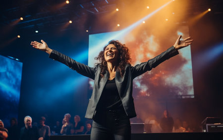Exited woman motivational speaker on stage Divers