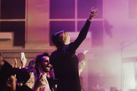 Krakow, Poland - September 20, 2014: Abstract background art of a cellphone camera capturing an artist performing rock music concert.
