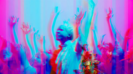 An energetic crowd with hands raised high dances joyfully as vibrant beams of light illuminate the stage. The atmosphere is electrifying, full of excitement and celebration at night.