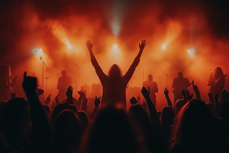 Excited Crowd with Raised Hands Enjoying a Memorable Live Music Performance Under Bright Stage Lights