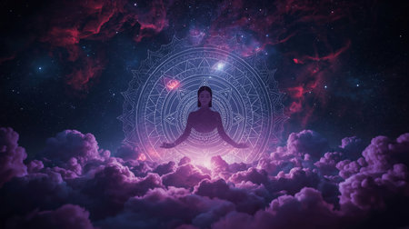 Young man practicing yoga and meditation in space with glowing aura, channeling cosmic energy and finding inner peace