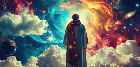 Virgin Mary statue in the sky with stars and nebula background.