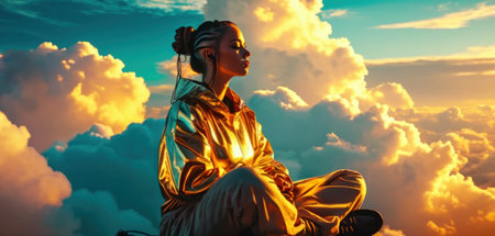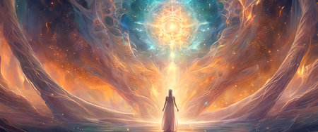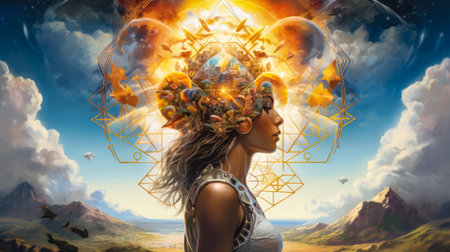 Artistic portrayal of a serene woman surrounded by a radiant, mystical energy field