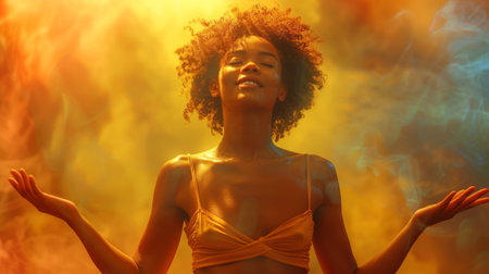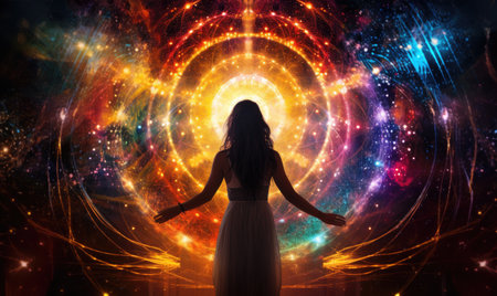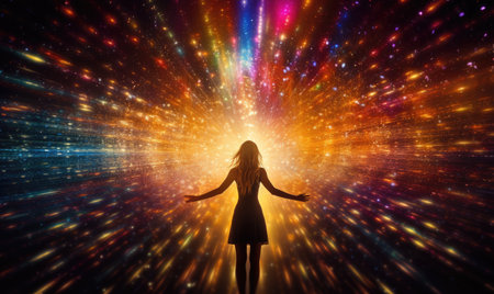 A woman in a flowing white dress sits with her eyes closed and her arms outstretched, bathed in a captivating explosion of light. Bright beams of colorful light surround her, creating a magical atmosphere.
