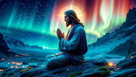Generative AI : Jesus on the cross over the clouds with aurora borealis Northern lights jesus shadow on the Planet Earth Elements of this image furnished by NASA