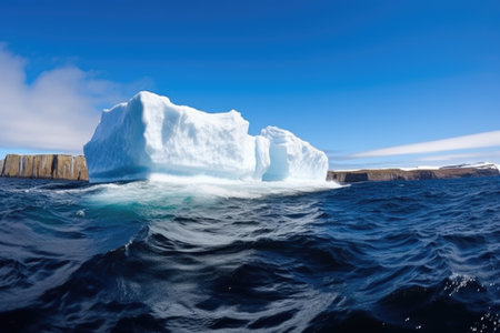 A large iceberg floats in the middle of the ocean, showing its imposing size and presence on the water. Created with Generative AI