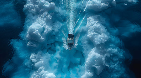 Aerial view of a boat in the ocean with icebergs.