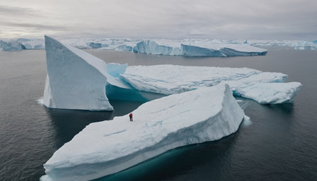 A serene landscape of icebergs floating in the ocean under a cloudy sky