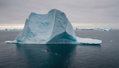 A red research vessel glides through calm Arctic waters, reflecting on the surface, with an enormous iceberg looming close by in the morning light.