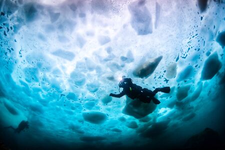 Diver on the ice against the blue iceberg. Antarctica