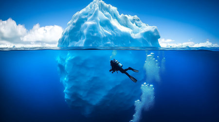 A scuba diver explores the majestic underside of a giant iceberg, its icy blue surface illuminated by sunlight. This summer activity highlights the stunning coastal beauty.