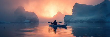A person kayaking on a calm body of water during sunset. The sky is painted with hues of orange, pink, and purple, reflecting off the waters surface.