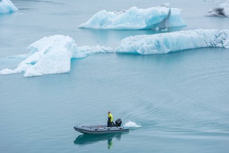 JOKULSARLON, ICELAND - MAY 23, 2019: Ranger guard patrolling in a boat at Jokulsarlon glacial lagoon