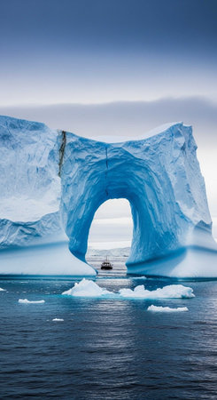 A massive iceberg floating in the vast ocean. Perfect for illustrating the awe-inspiring power and beauty of nature. Ideal for use in educational materials or climate change-related projects.