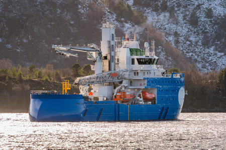 ULSTEINVIK, NORWAY - 2020 MARCH 03. Windfarm vessel on sea trials trip inside the fjord.