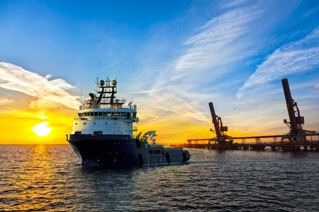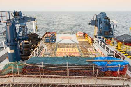 Supply boat transfer cargo to oil and gas industry and moving cargo from the boat to the platform. Boat is waiting transfer cargo and crews to platform.