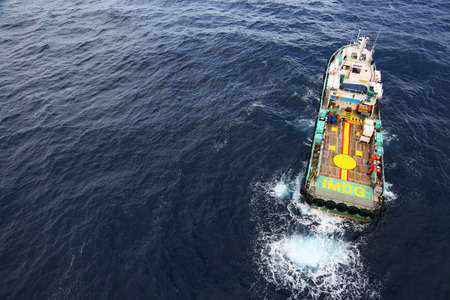 Offshore supply boat sea support ship oil industry during. Aerial top view.