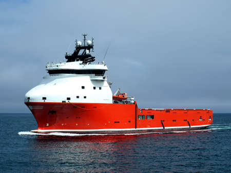 Modern offshore support vessel. Large red industrial ship with crane and lifeboat. Maritime transport and logistics for the oil and gas energy industry.