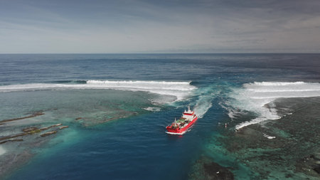 Red cargo ship is sailing in the ocean near a coral reef with breaking waves, creating a captivating scene of maritime activity and natural beauty