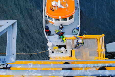 Songkhla province, Thailand ,December 05, 2020 :Workers are lifted by the crane to the offshore platform, Transfer crews by personal basket from boat.