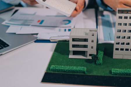 model home and building project detail in the office, sign purchase sales contract, agreements concerned mortgage loan offer and insurance.