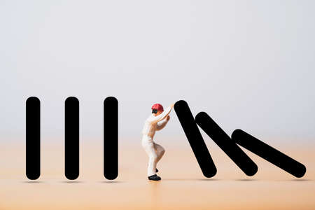 Miniature worker figure pushing rectangular bar which falling to prevent another bar standing for risk management control concept.