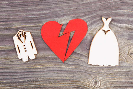 Divorce and canceling marriage concept. Broken heart and wedding dresses on wood.