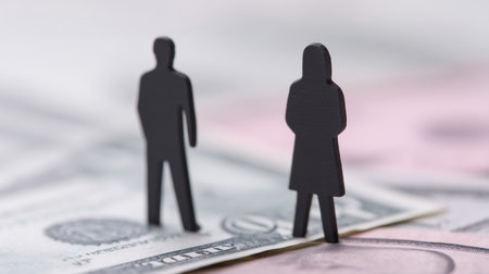 Miniature figurines of a man in a suit and a woman in a dress standing on uneven stacks of coins, representing the concept of gender pay gap, income disparity, and financial inequality.