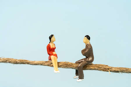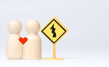 A picture of male and female peg dolls, love and winding road sign on copyspace white background. Marriage life is full of challenge